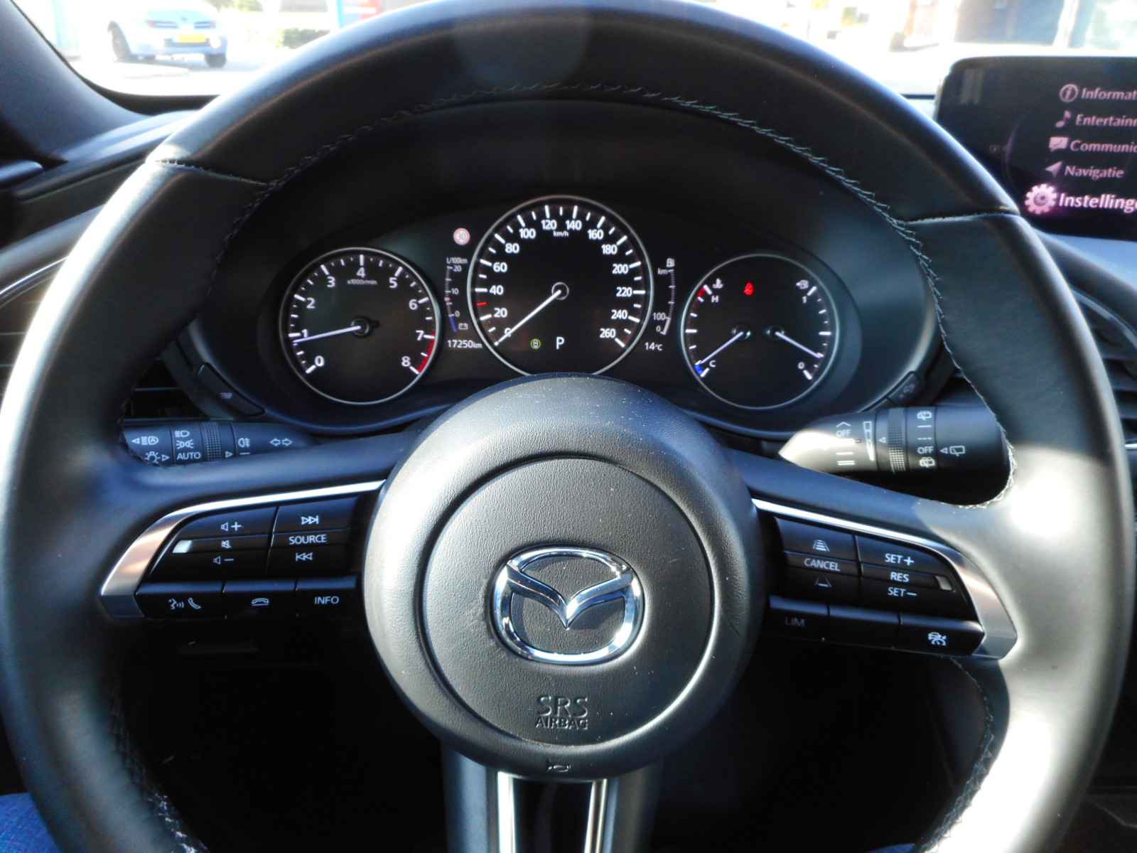 Altijd achter zicht, nooit meer nekkramp! De achteruitrijcamera maakt het supermakkelijk. Adaptive cruise control is een comfortabele en veilige optie. Het systeem reguleert de snelheid en houdt automatisch afstand tot uw voorligger. In één oogopslag weet u de complete systeemstatus van deze auto. Dankzij Connected Services. In deze auto beschikt u natuurlijk over een full map navigatiesysteem. Het audio-installatiesysteem met DAB-radio biedt glasheldere geluidskwaliteit. U bedient dit veilig via het stuurwiel. Zoals van een eigentijdse auto verwacht mag worden, is deze Mazda 3 voorzien van een draadloze oplaadmogelijkheid voor telefoons. Wat u ook in deze auto kunt vinden zijn electronic climate control, regensensor, keyless entry, automatisch dimmende binnenspiegel, lederen stuur en boordcomputer.